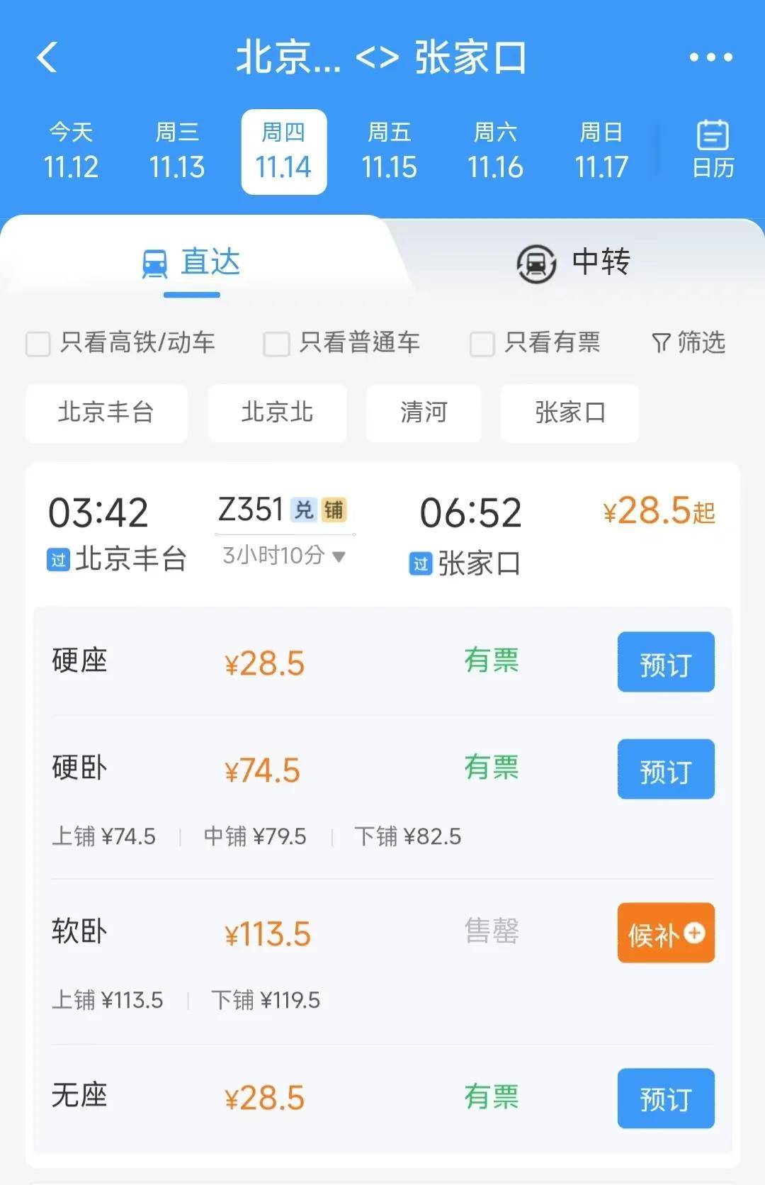 刚刚,小编在12306App查询了丰沙线恢复后张家口⇋北京的具体车次,详情如下↓↓↓