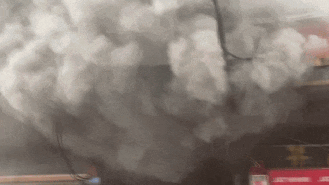 这时,附近的人们抬着梯子冲向起火的综合楼,准备营救楼上被困人员,紧接着,二楼博弈教育培训机构后窗就有大量黑烟向外涌出,仅仅几分钟时间,画面中就充满了黑烟。从起火现场外围的公共场所视频可以看到,黑烟肆意向外翻滚,遮天蔽日,很快就将整栋综合楼卷入滚滚浓烟之中。