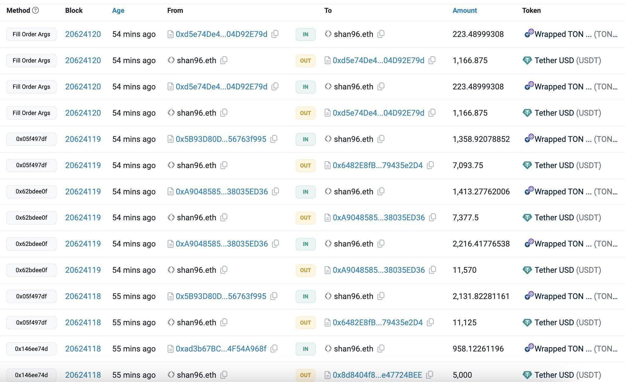 1小时前,Shan (@shanicucic96) 在以太坊网络上以 $5.22 的价格购买了 38,282 枚 $TON,花费了 200,000 $USDT。
