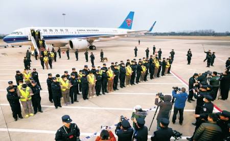 2月20日,随着中国民航包机降落在南京禄口机场,缅甸妙瓦底地区的200名中国籍涉诈犯罪嫌疑人,经泰国被我公安机关押解回国。 新华社发