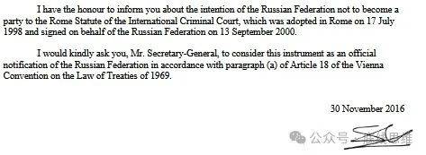 2016年,俄方表示无意成为《国际刑事法院罗马规约》的缔约方。联合国