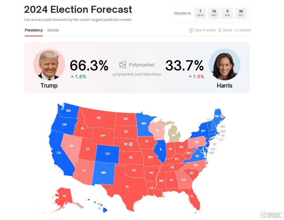 目前,特朗普赢得总统的可能性高达66%,哈里斯则不到34%。