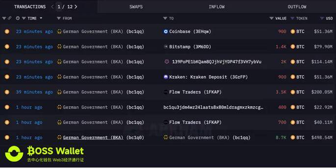 据区块链数据平台BOSS Wallet称,被标记为属于德国政府的比特币钱包分几批将总计约 16,309 BTC 转移到外部地址,包括加密货币交易所 X.GAME、Bitstamp、Kraken 和 Coinbase 以及做市商 Flow Traders 和 Cumberland DRW。