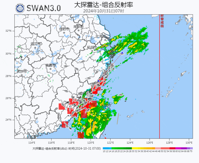 降水预报:10月31日08时至11月1日08时,福建东北部、浙江中东部、上海、江苏南部等地有暴雨,其中,福建东北部、浙江东部等地的部分地区有大暴雨(100-220毫米);台湾岛有大暴雨,台湾岛东部的部分地区有特大暴雨(250-800毫米)。